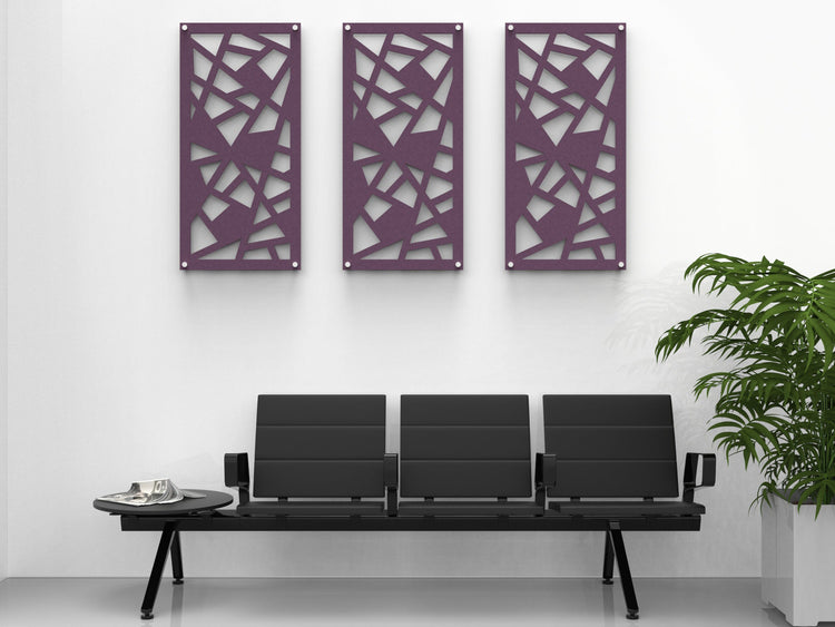 Our Broken Window pattern is cut into this 2x4 acoustic panel. The acoustic felt absorbs sound echo and reverberation in your space.