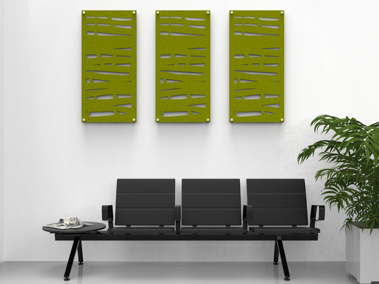 Our Overgrowth pattern is cut into this 2x4 acoustic panel. The acoustic felt absorbs sound echo and reverberation in your space.