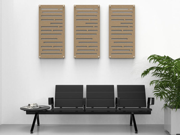 Our Slats pattern is cut into this 2x4 acoustic panel. The acoustic felt absorbs sound echo and reverberation in your space.