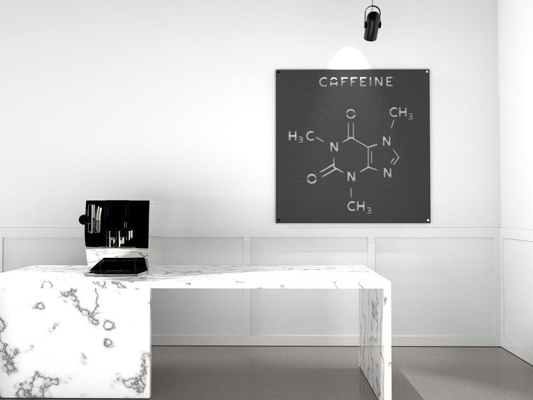 A molecular graph of Caffeine is cut into this 4x4 acoustic panel. Mount this panel with standoffs to reduce sound echo and reverberation.