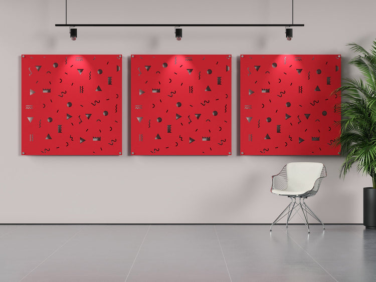 Our Confetti pattern is cut into this 4x4 acoustic panel. Mount this panel with standoffs to reduce sound echo and reverberation.