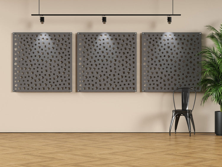 Our Squares pattern is cut into this 4x4 acoustic panel. Mount this panel with standoffs to reduce sound echo and reverberation.