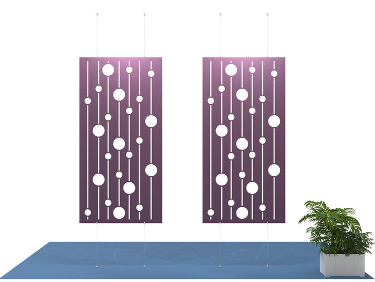 Descending Circles hangs from the ceiling and can be fastened to the floor as an option. The divider is made of acoustic felt to provide privacy and dampen sound echo.
