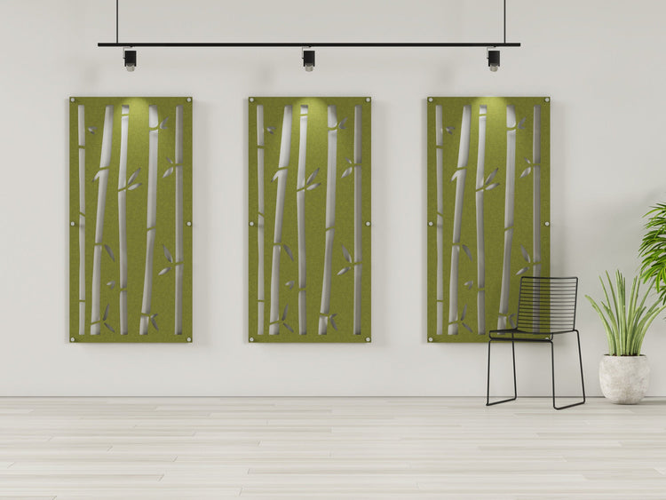 Our Bamboo pattern is cut into this 4x8 acoustic wall panel. The panel is made of acoustical felt to dampen echo and reduce reverb.
