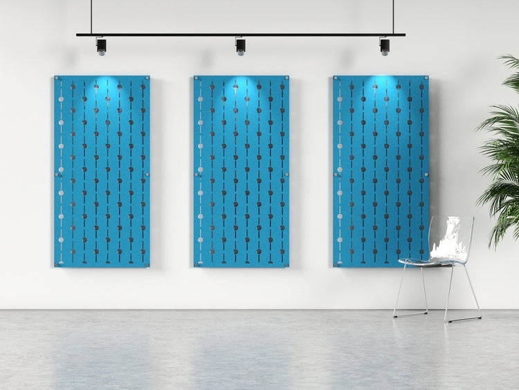 Our Racing Dots pattern is cut into this 4x8 acoustic wall panel. The panel is made of acoustical felt to dampen echo and reduce reverb.