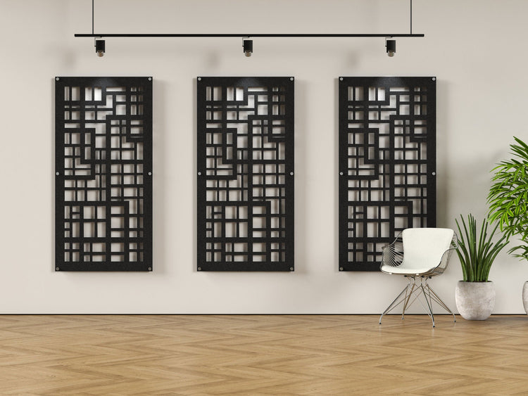 Our Square Pipes pattern is cut into this 4x8 acoustic wall panel. The panel is made of acoustical felt to dampen echo and reduce reverb.