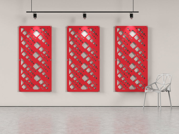 Our Squares on 45 pattern is cut into this 4x8 acoustic wall panel. The panel is made of acoustical felt to dampen echo and reduce reverb.